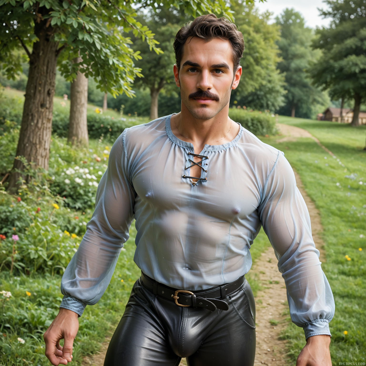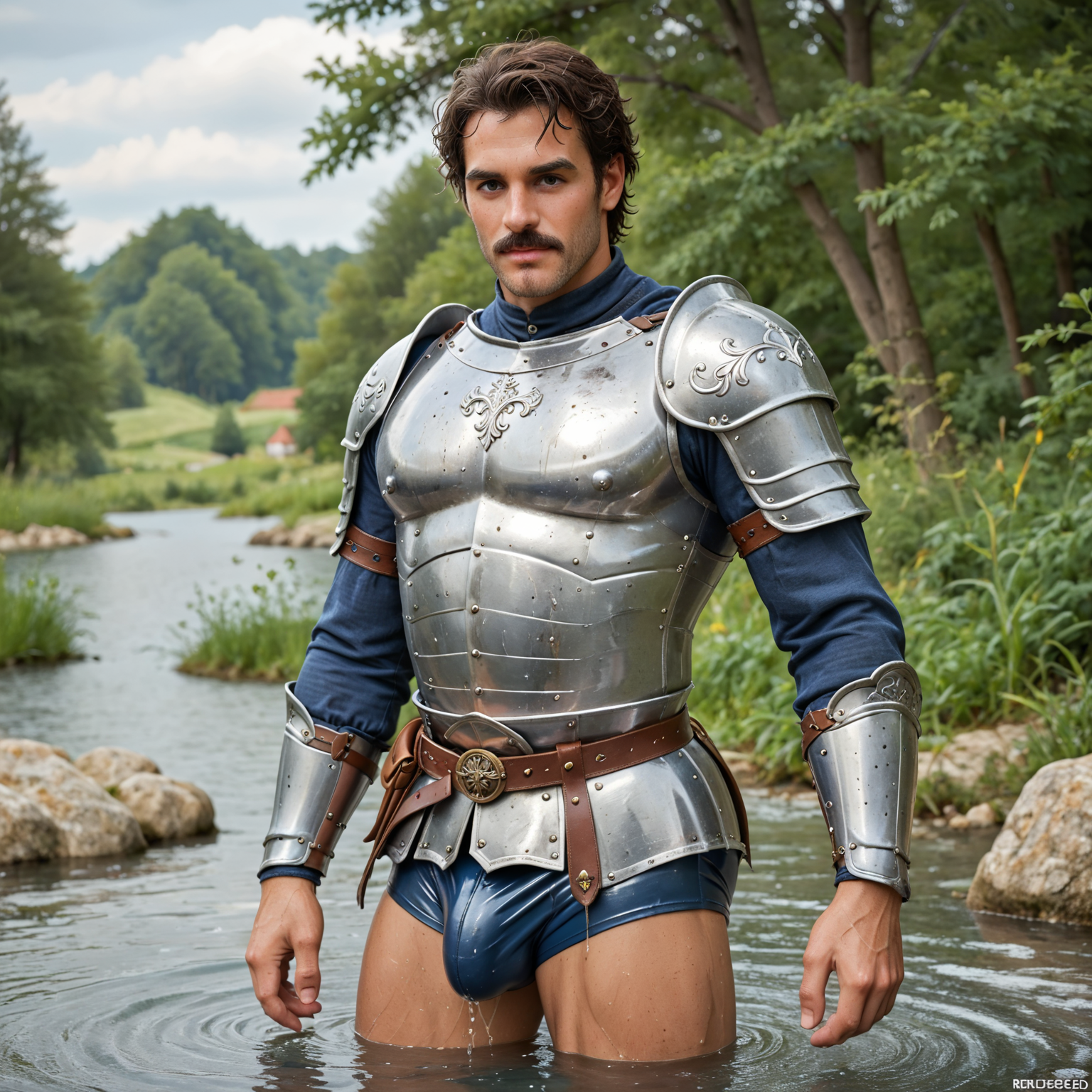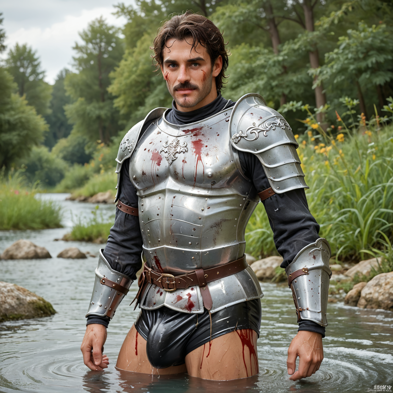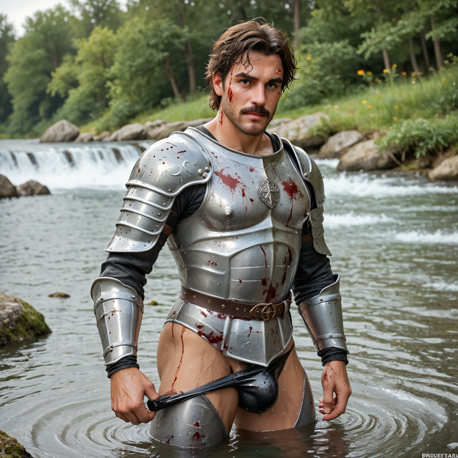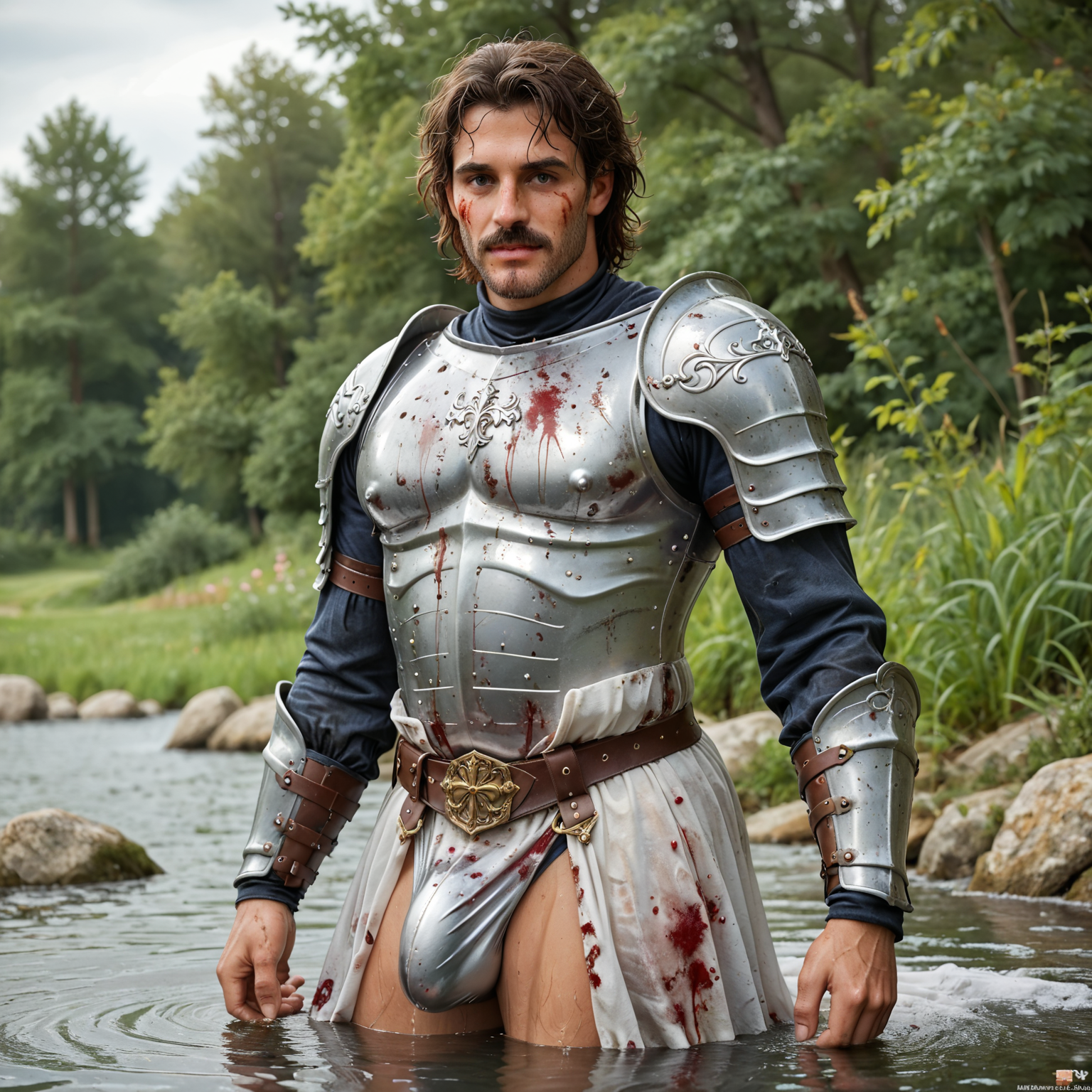 The knight rises and exits, shedding his armor piece by piece as he steps into the sunlit river outside the castle. Water cascades over his muscled body, washing away the grime of battle, glistening in the daylight. He pauses, noticing a familiar presence at the riverbank—a fellow knight, eyes locked onto him, filled with curiosity and longing.