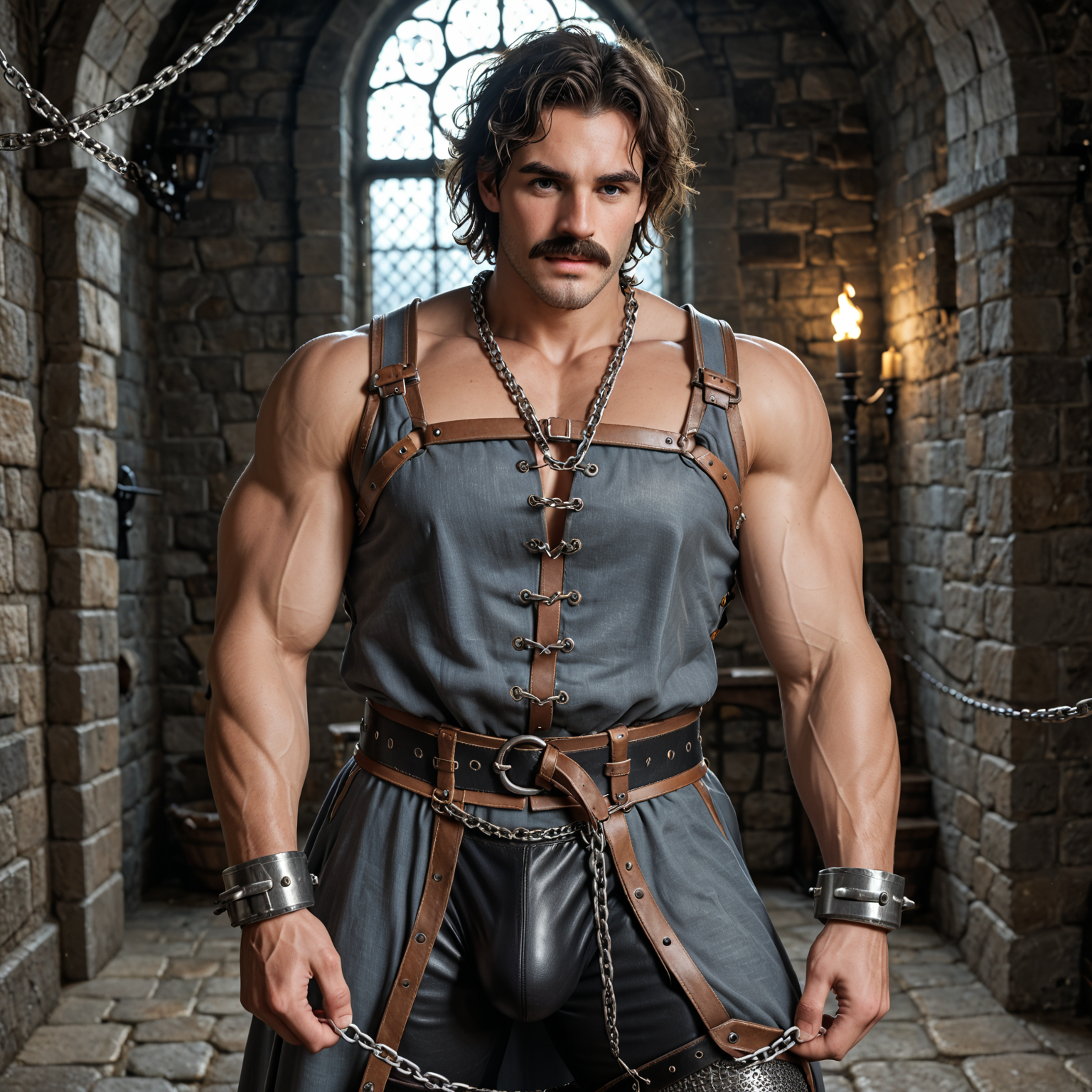 Chains clink softly in the darkness of the dungeon. Torchlight flickers, illuminating the knight’s muscular form, wrists bound, yet his gaze defiant. The king steps forward from the shadows, fingers tracing the knight’s jaw with calculated intention. "You disobeyed me," the king whispers, his voice thick with authority, inviting challenge rather than apology.